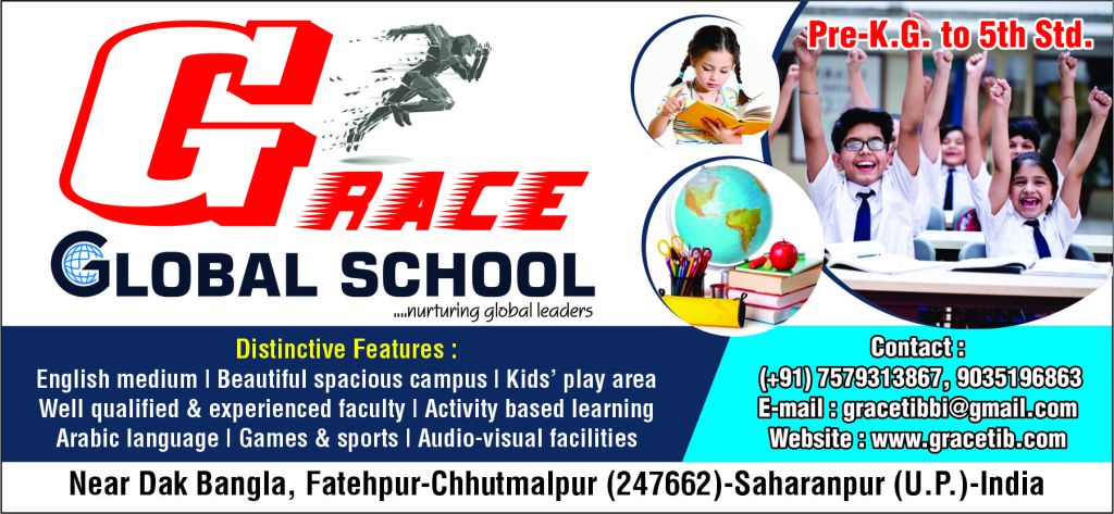 Grace Global School was established at Fatehpur, Chhutmalpur, Saharanpur, U. P. India to follow the International Standards of imparting education. Activity based learning is our first priority to make the learning easy. Audio-Visual facilities are provided to make the outcome of teaching long lasting for all the students. We believe that every student is smart and it depends on how we nurture them in accordance to the way of their interest. We have a long list of programs and competitions to showcase their hidden talents and to boost confidence. Grace Global School, with the vision of “Perfection in education with practical experimental learning” believes in providing the students with excelled education, a firm grounding in moral and ethical values which are need of the hour. Our goal is to incorporate critical thinking, analytical reasoning, and problem-solving skills in a student-centered environment. We inspire our pupils with a special focus on each individual, to develop their innate abilities to the maximum. The curriculum at GGS is emphasized to create an active learning environment in which experimentation, exploration, intellectual curiosity, and self-discovery are encouraged. To impart education of the highest standard and to facilitate an atmosphere of learning, G.G. School is equipped with comfortable and spacious classrooms, open play area, Kids’ park, sufficient staff rooms, office, hygienic washrooms, and other amenities which will ensure the children to learn values, discipline, knowledge, and etiquettes under the same roof. It is the perfect place for the all-around development of the students. It is an educational center built on ideas of greater-good which needs to bring itself forward for education.